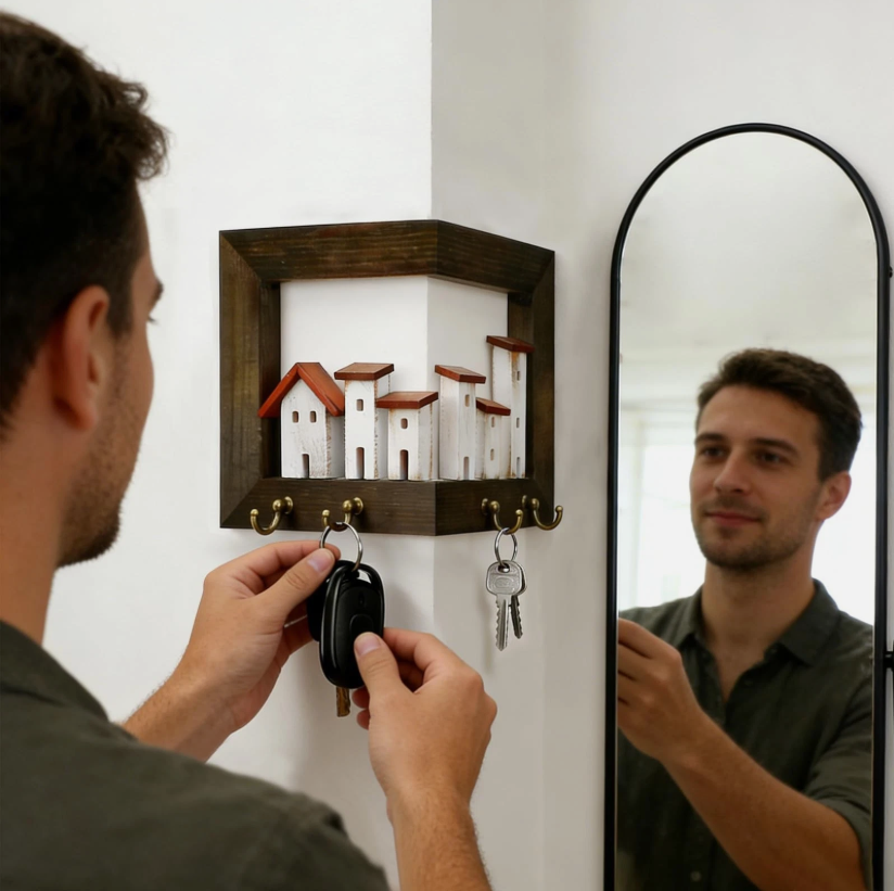 This elegant wooden wall key holder transforms any space with its rustic charm. Thoughtfully designed for style and convenience, it’s the perfect accent for your home while keeping keys within reach.